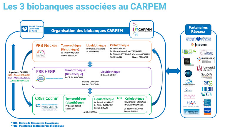 Le CARPEM a pour objectifs de coordonner et d’harmoniser les méthodes de stockage de tissus tumoraux. Le travail collaboratif de ces trois banques de tumeur, grâce au recrutement de trois ingénieurs par le CARPEM (un dans chacune des structures), a permis l’extension du projet OncoHEGP (banque de tumeurs lancée en 2011 à l’HEGP). Nommé OncoCCH à Cochin (2015) et OncoNEM à Necker (2017), ce projet, dédié à la gestion des ressources biologiques collectées au cours de soins standards, a pour objectif principal de renforcer les ressources biologiques disponibles pour la recherche.